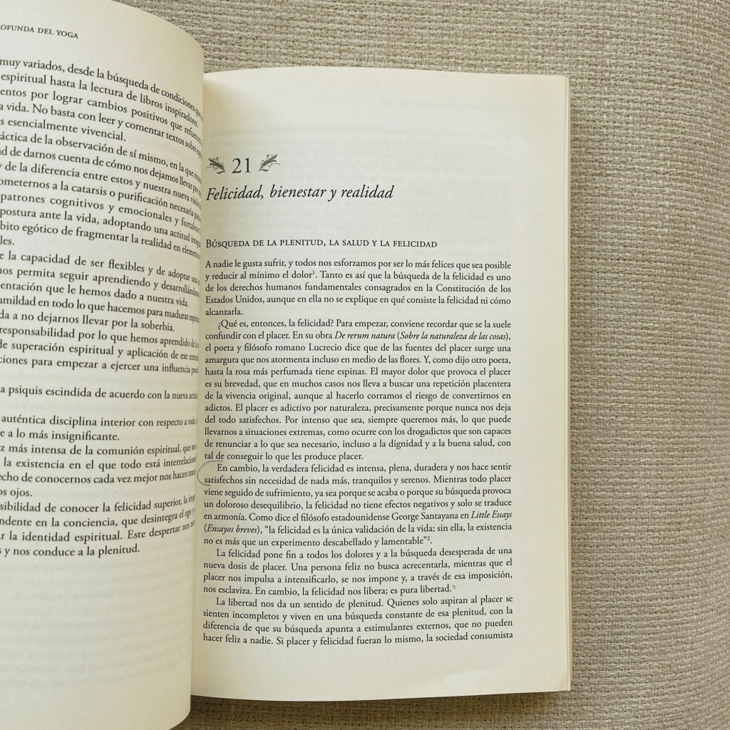 Conecto este principio con las doctrinas del yoga que hablan de que los humanos ignoramos nuestra verdadera naturaleza y, a través de la práctica de los diferentes aspectos del yoga, podemos reconocer lo que somos y así encontrar la libertad. Personalmente, pienso que aquí hay mucha sabiduría ya que, la respuesta a la pregunta ¿Qué es real y qué irreal o ilusorio?, sin bien puede ser diferente para cada una, determinará la relación que tengamos con nosotras mismas, con los demás y con la vida. Según Feuerstein, es en esa pregunta donde se esconde el secreto de la felicidad pues, «todo lo que hacemos está determinado por nuestra imagen de las cosas», es por eso que «el despertar y la realidad son esencialmente iguales» pues, una vez encontramos que es lo real, eliminamos los filtros que la mente crea y podemos actuar acorde: «Lo único que nos puede liberar es la realidad.»